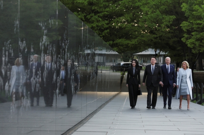 미국을 국빈 방문한 윤 대통령과 부처, 워싱턴DC 인근 앤드루스 공군기지에 도착해 공군 1호기에서 내리고 있다. 2023.04.25. |