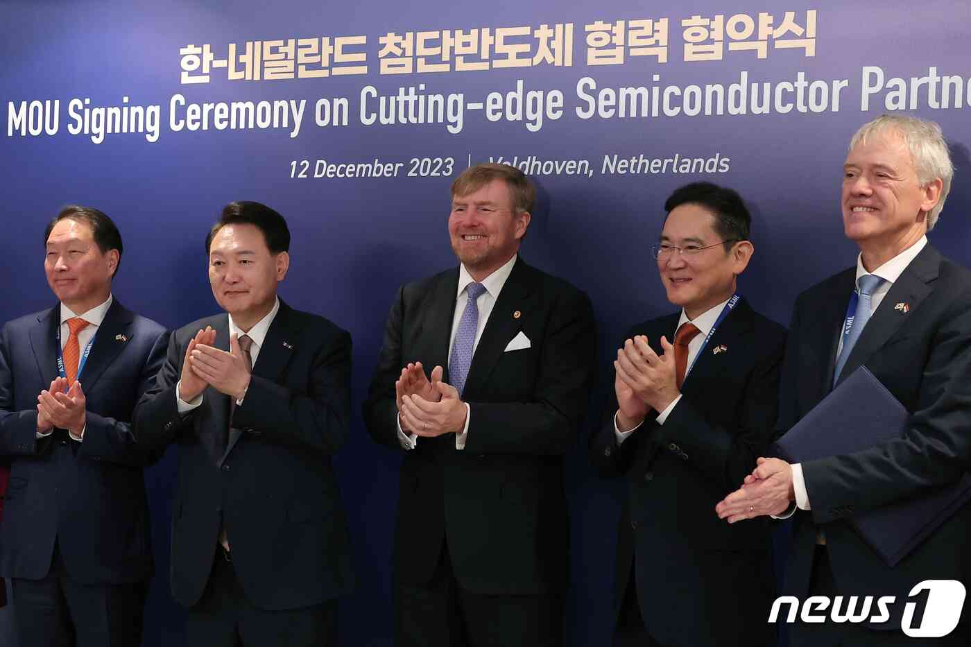 12일(현지시간) 벨트호벤 반도체 장비기업 ASML 본사에서 열린 한-네덜란드 첨단반도체 협력 협약식에서 기념 촬영하고 있다. 네덜란드 국왕 부부가 13일(현지시간) 암스테르담 시내 공연장에서 열린 답례 문화 공연을 지켜보고 있다. |